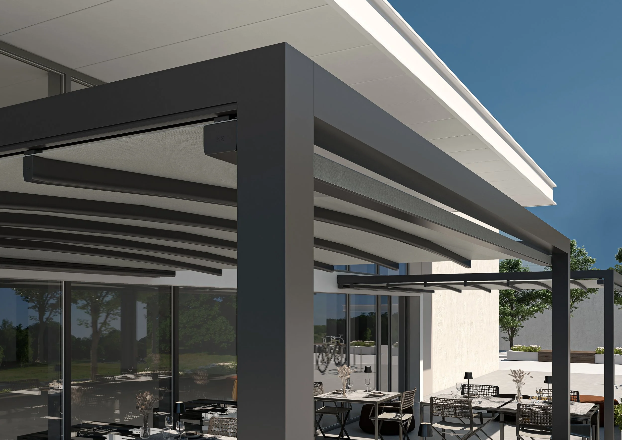 Optional illumination: LED lighting can be installed when opting for motorised features of the awning.